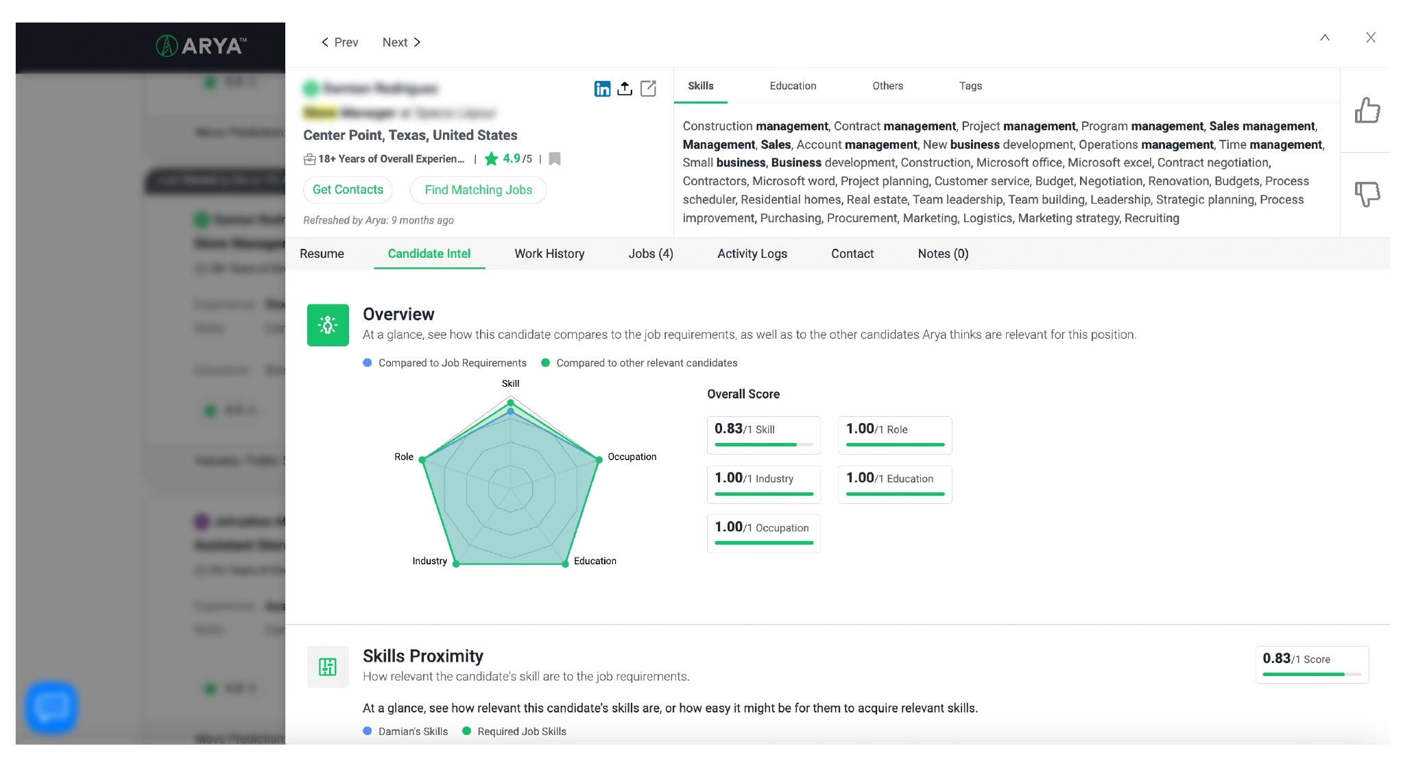 Get even more insights into a candidate and what makes them compatible with Candidate Intel. Click on the Candidate Intel tab and get a detailed breakdown of the candidate’s overall score and how well they align with the job requirements. You can also gain an understanding of how relevant their skills are to the job, or how easy it might be for them to acquire the relevant skills.