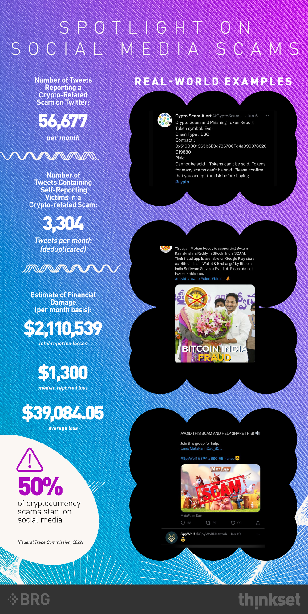 To fight back against crypto scams, it’s essential to first understand them. To that end, we created two infographics: the first, “Crypto Scams 101” outlines the basics contours of these scams; the second, “Spotlight on Social Media Scams” draws on proprietary BRG data analytics, machine learning models, and natural language processing to illuminate the role platforms like Twitter play in such scams.