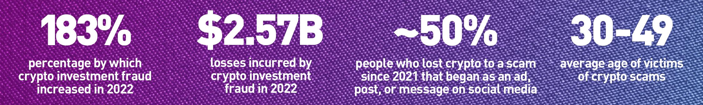 - ~50% of people who reported losing crypto to a scam since 2021 said that it started with an ad, post, or message on a social media platform